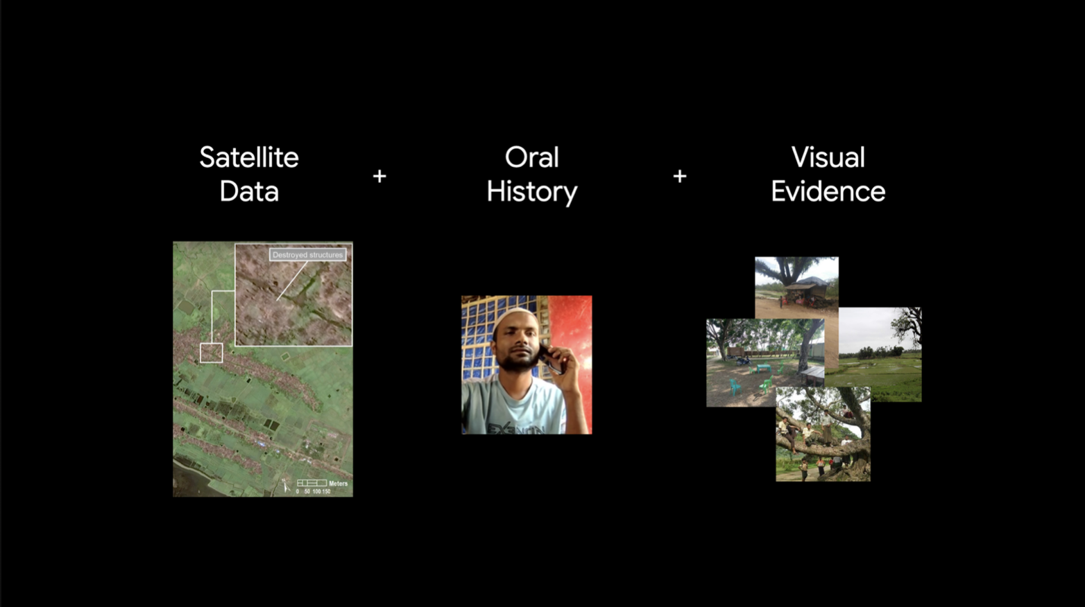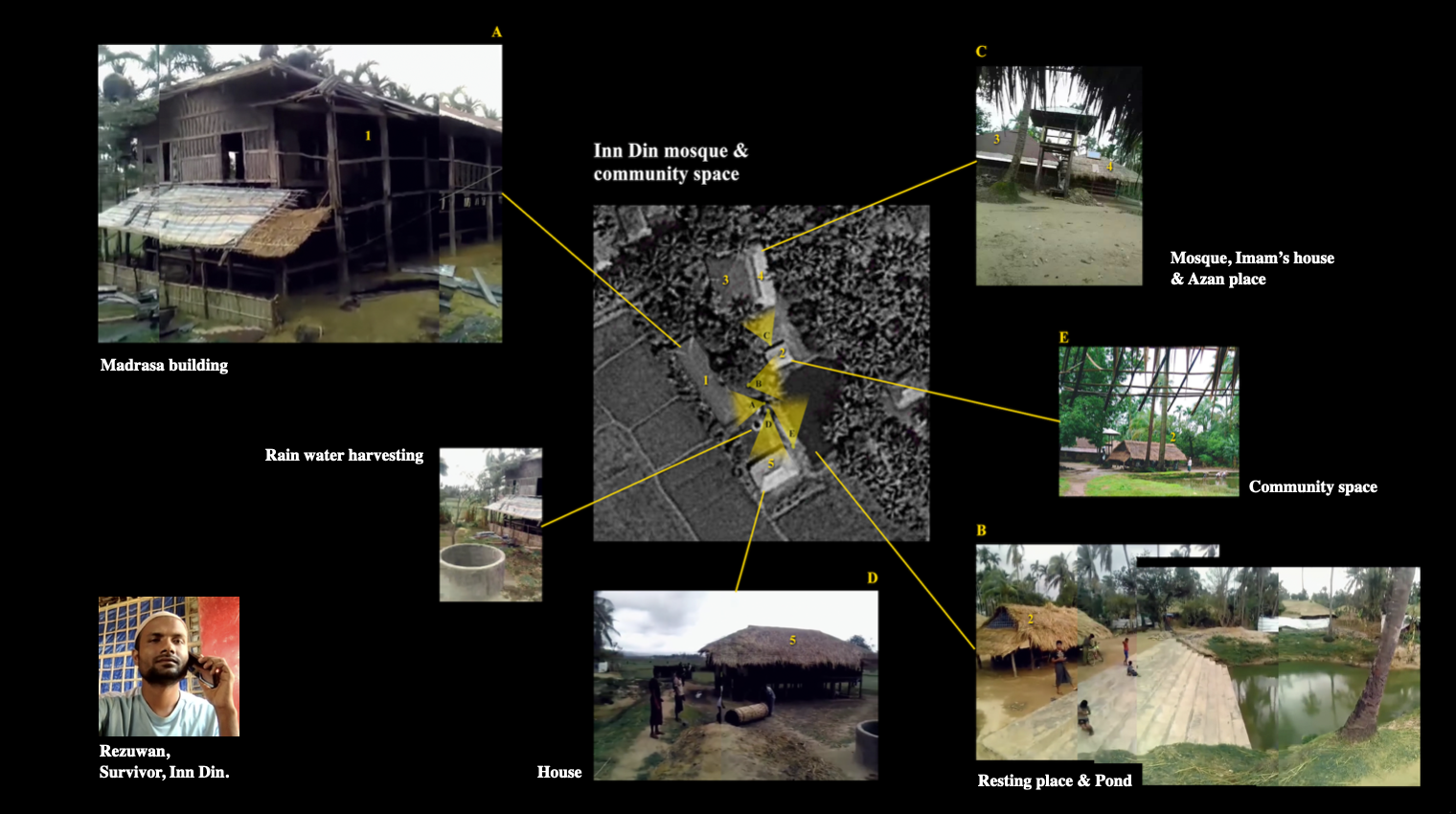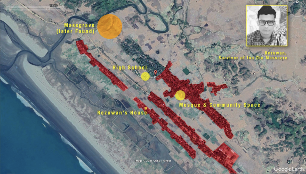 The project brings together satellite imagery, geospatial analysis, oral histories, photography, mapping and 3D modeling to virtually reconstruct villages that no longer exist. Using satellite data and remote sensing technologies, former settlements are identified, traced, and layered with testimonies from survivors who now live in refugee camps in Bangladesh. These personal narratives—of home, loss, displacement, and resilience—are not treated as abstract histories, but are anchored to precise geographic coordinates, transforming memory into a living, mappable archive.